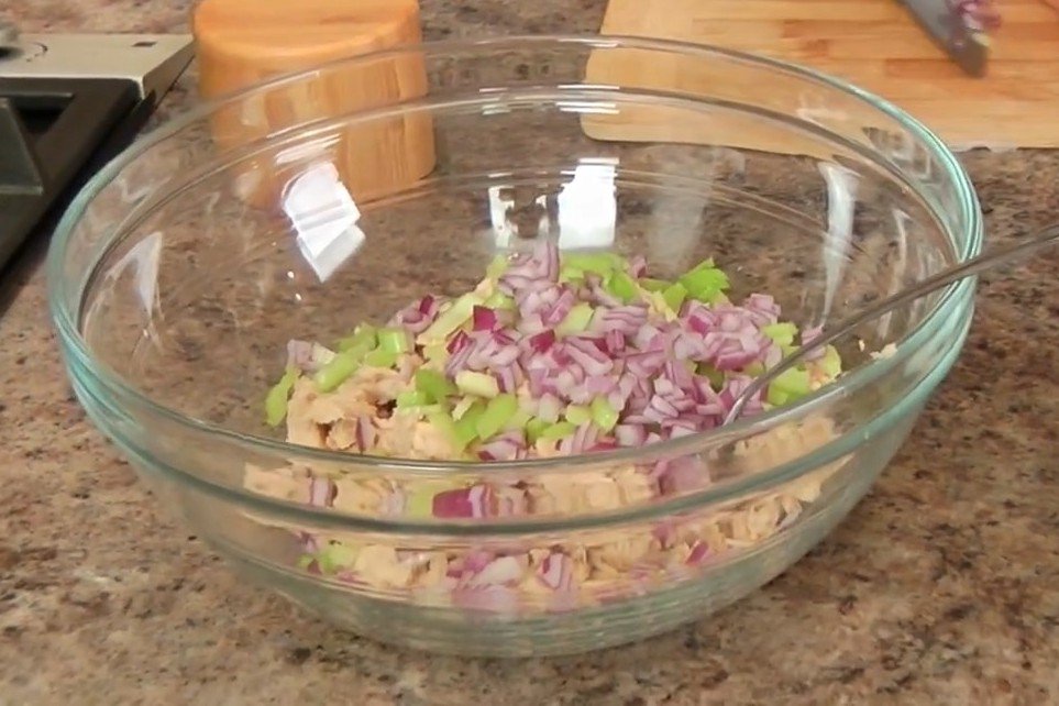 Transfer the drained tuna to the mixing bowl with the diced vegetables. Gently fold to combine, keeping tuna flakes intact. This initial mix ensures even distribution before adding wet ingredients.