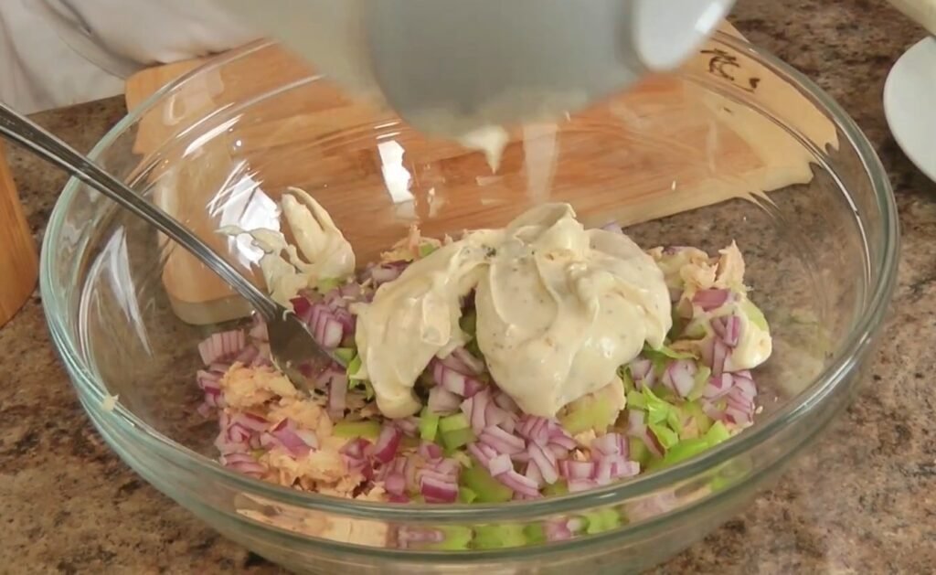 Pour the dressing over the tuna and vegetables. Use a spatula to fold gently from the bottom up, coating every flake without mashing. The goal is a light coating, not swimming in mayo, to let tuna shine. Add salt to taste now, mixing thoroughly. This “edible glue” binds ingredients perfectly.