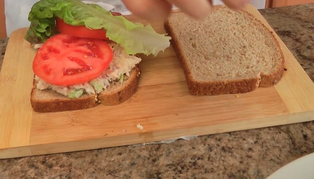 Slice whole grain bread into thick pieces for hearty sandwiches. Spread a thin, even layer of chilled tuna salad corner to corner on one slice. Avoid thick piles to prevent fallout. Layer 2-3 juicy tomato slices for sweetness and moisture, then add a couple lettuce leaves for crunch and color. Top with second bread slice.