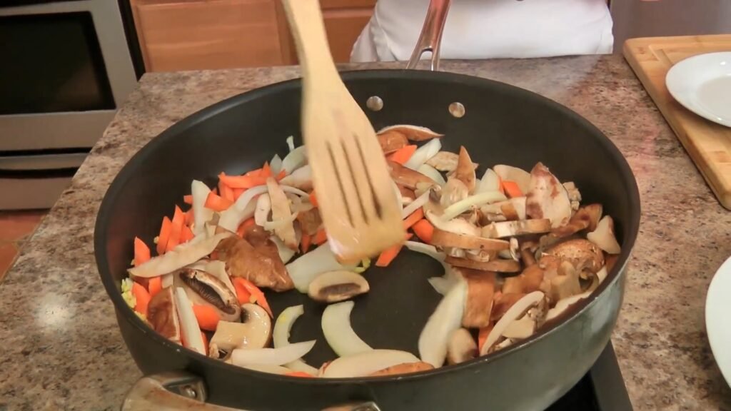 3. Stir fry the aromatics and vegetablesAdd the sliced onion and chopped ginger to the hot, oiled pan along with the sliced shiitake mushrooms and matchstick carrots, tossing everything quickly so it is coated in the shimmering oil. Stir fry this mixture over high heat for about 3 minutes until the onions soften slightly, the mushrooms release a bit of their moisture and the carrots start to become tender while still holding some crunch.