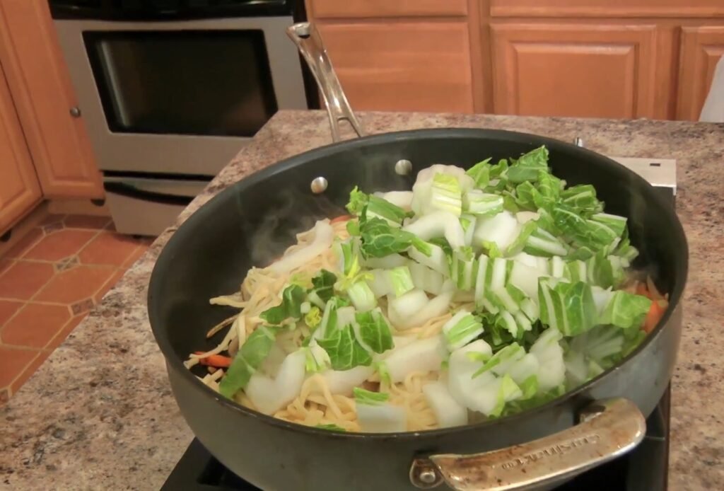 Once the vegetables have sautéed for a few minutes, add the drained egg noodles directly into the pan, using tongs to gently lift and separate them so they combine with the onions, mushrooms and carrots. Scatter the quartered baby bok choy over the top, positioning some of the white stems against the bottom of the pan so they have a chance to soften while the leafy tops wilt.