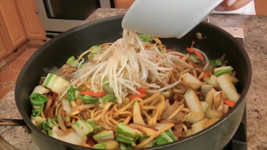 In the last 30 seconds of cooking, add a generous handful of bean sprouts to the wok, scattering them over the top of the noodles so they barely soften in the residual heat. Quickly toss once or twice just to mix them through, then remove the pan from the heat so the sprouts retain their fresh crunch and the vegetables do not overcook.