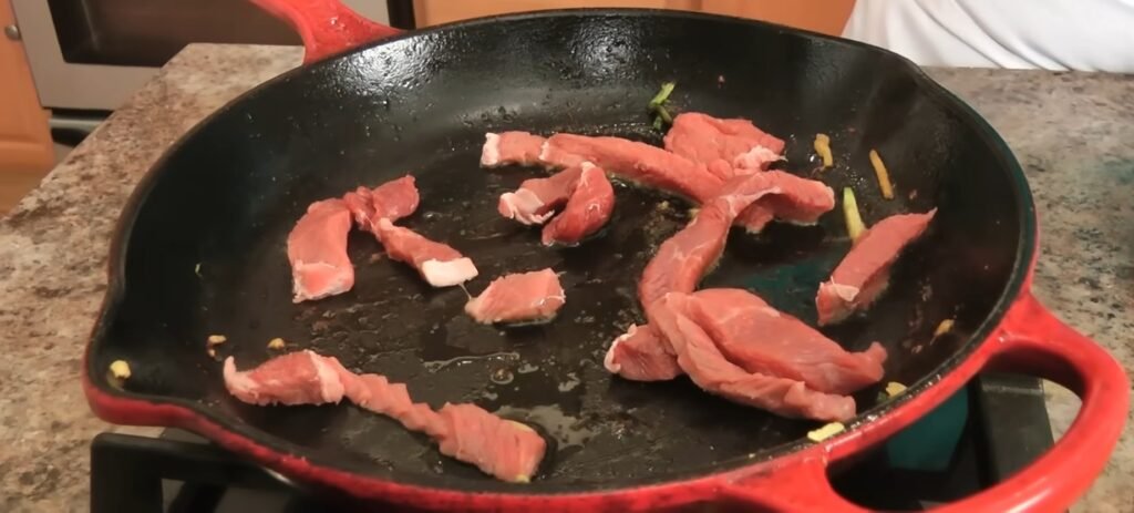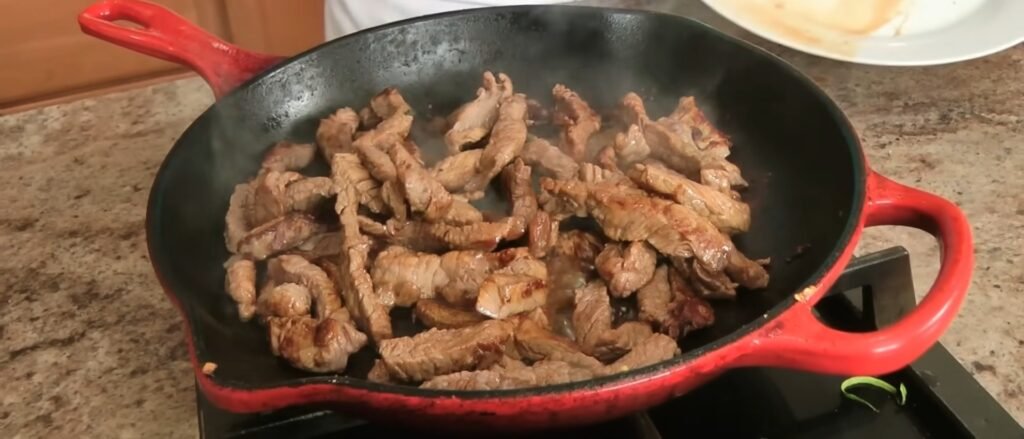 Cook this first batch for roughly a minute, turning the pieces once so they develop good color while staying tender and slightly pink inside, then remove them to a plate. Repeat the same process with the remaining beef, again avoiding overcrowding the pan and keeping the cooking time short since the thin slices only need a brief sear.