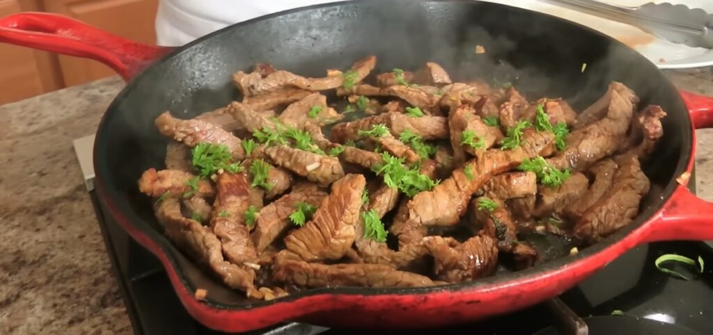 Lower the heat slightly at this stage so the garlic and butter can mingle with the browned bits on the bottom of the pan and release their flavor without scorching. Sprinkle in the chopped fresh parsley and squeeze the juice of half a lemon over the mixture, stirring everything together so the bright citrus and herbs balance the richness of the butter and beef.