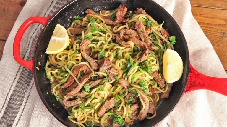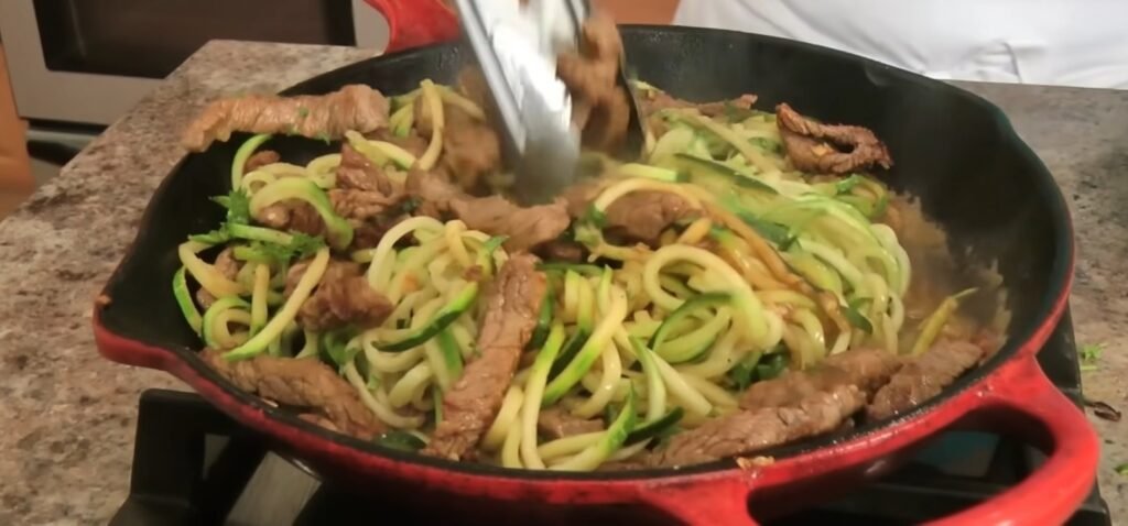 1. Prep Time – Slicing beef thinly, spiralizing zucchini, and mincing garlic takes 15 minutes total.